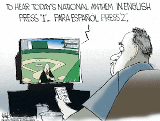 This link, taken from The Onion, shows a series of responses to the elimination of bilingual education for Spanish-speaking immigrants in California. These include statements such as: "it is vital that Spanish-speaking immigrants learn English. How else are they supposed to understand how I want my hedges clipped?" (Oliver Kittridge, lawyer) and "we don't need bilingual education. We just need to speak louder and slower, and finish all sentences with 'comprende'" (Richard Moore, systems analyst). Although these statements are clearly meant as jokes, they play into real fears that many people against bilingual education have voiced. Due to the close link that is often created between language and nationhood, some fear that bilingual education might somehow result in other aspects of culture, such as television or the National Anthem as seen in the cartoon above, becoming portrayed in both English and Spanish, which would serve to diminish some of the "American nationhood."